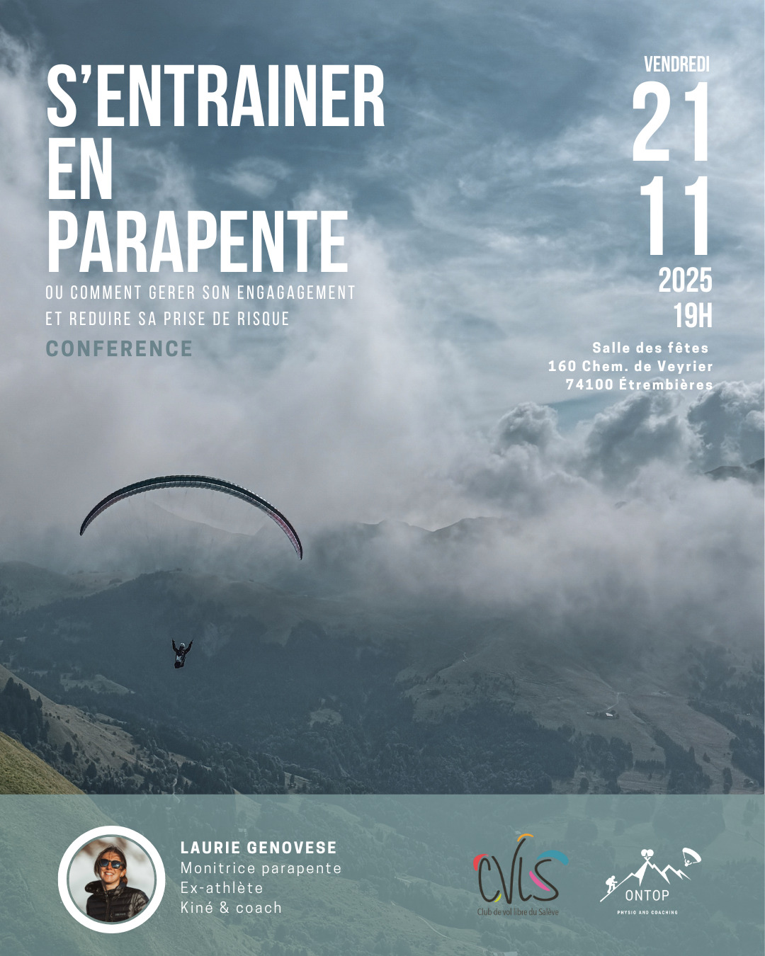 – Une conférence « s’entraîner en parapente, comment gérer son engagement et réduire sa prise de risques »